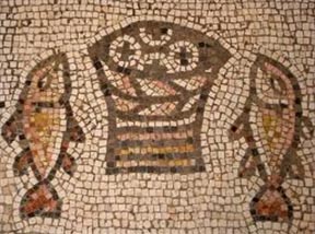The symbol of the loaves and the fishes is one of the earliest symbols of the Eucharist. It is an explicit connection between the multiplication of the loaves and fishes to the Holy Sacrament of the Mass. The mosaic pictured above comes from a very ancient church in Israel in a city called Tagbha that dates from the 4th century.